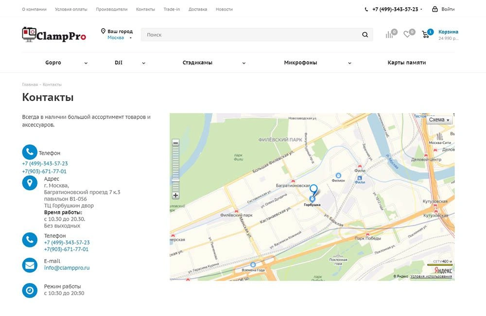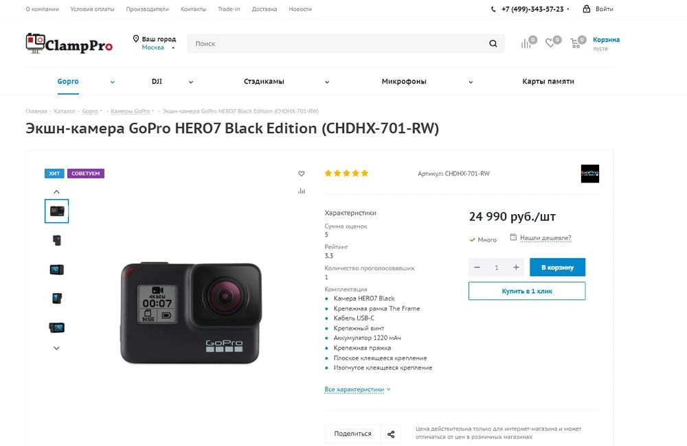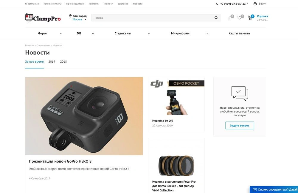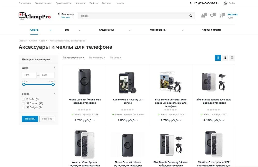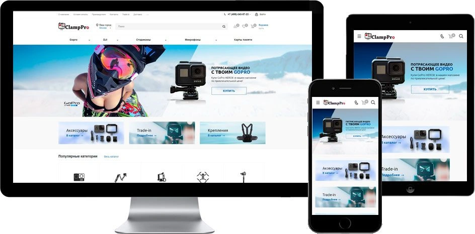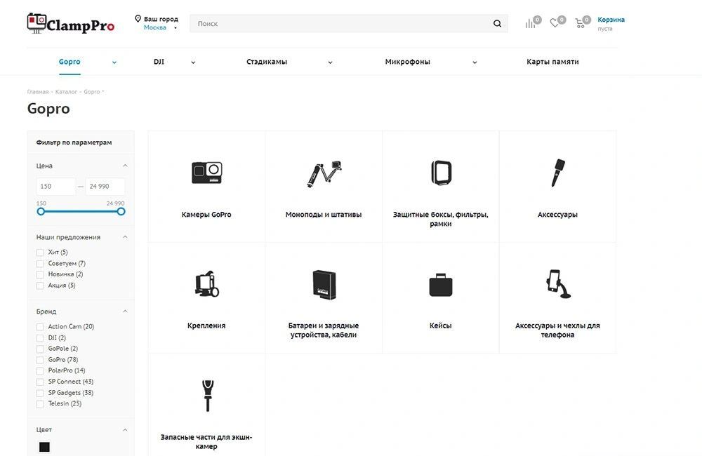 Интернет-магазин ClampPro предлагает широкий ассортимент камер GoPro и техники DJI, а также стедикамов, микрофонов и прочих аксессуаров для блогеров и экстремалов. Компания имела собственный сайт на OpenCart с ограниченным функционалом и слабыми показателями. Мы подобрали готовое решение Аспро и выполнили переезд на Битрикс. Подключили и настроили мультирегиональность на крупные города миллионники, всего 20 поддоменов. Автоматически наполнили сайт товарами с помощью парсинга cайтов конкурентов. Настроили Real-Time обмен с 1С. Настроили модули оплаты и доставки. Выполнили внутреннюю оптимизацию и работы по продвижению сайта. За полгода трафик посетителей из поиска увеличился в 15 раз.